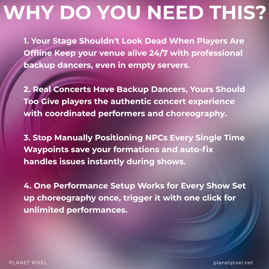A complete dance npc system for controlling backup dancers in your Roblox concert game. Control your NPCs with waypoint-based formations, trigger animations on command, and manage entire performances from a professional admin GUI. Everything is fully editable and customizable to fit your specific show or event.